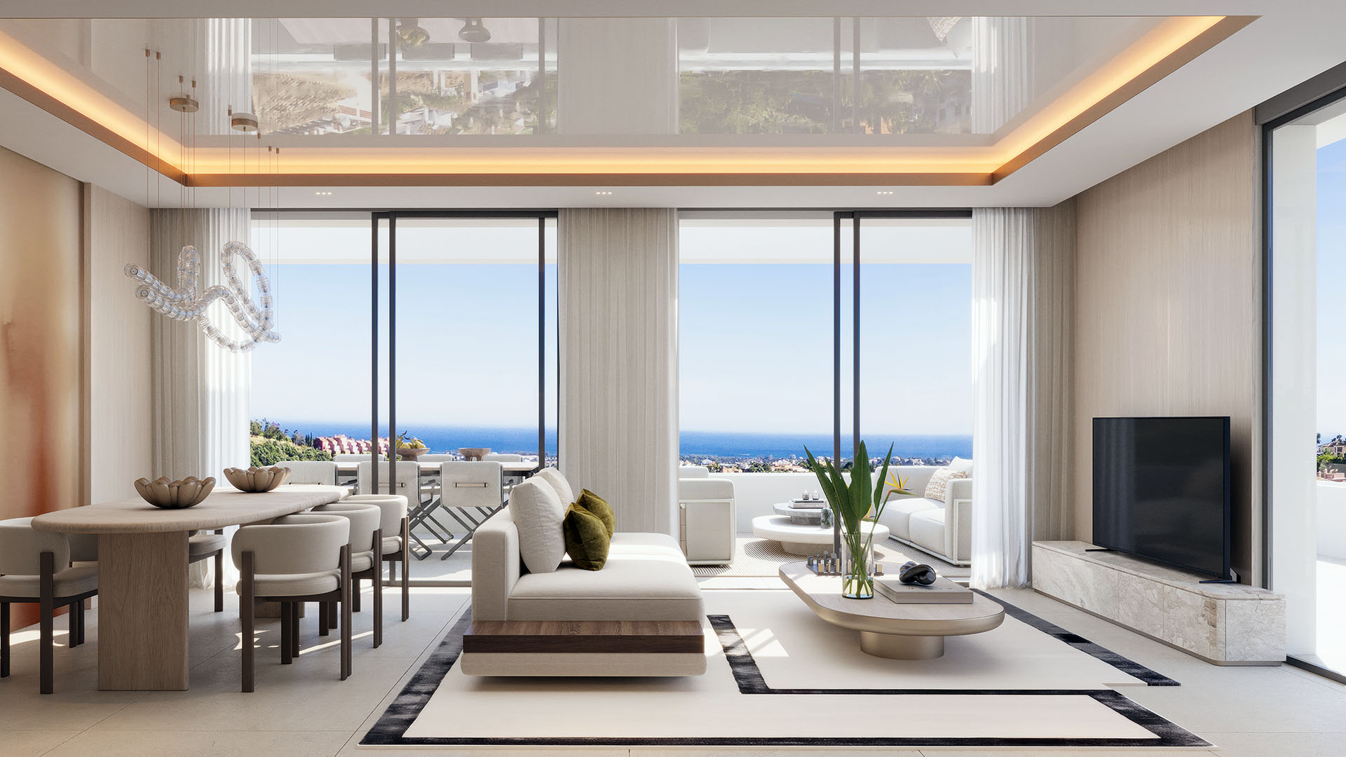 Dit nieuwe exclusieve project is een appartementencomplex bestaande uit drieënzestig woningen verdeeld over drie moderne blokken aan de eerste lijn van de golfbaan in Mijas Costa. Elk blok heeft vier niveaus: de appartementen op de begane grond, eerste en tweede verdieping bieden 115 vierkante meter binnenruimte plus een terras van 22 vierkante meter, terwijl de penthouses 130 vierkante meter binnenruimte bieden samen met hun eigen terrassen, elk van verschillende grootte. Het project biedt ook een selectie van voorzieningen ontworpen om het dagelijks leven te verrijken. Elk blok heeft zijn eigen ondergrondse parkeergarage. Bewoners kunnen genieten van een volledig uitgeruste fitnessruimte, een speciale spa-ruimte voor rustige ontspanningsmomenten en een groot centraal zwembad gelegen in brede, open groene ruimtes. Omringd door de eerste lijn van golf is de gehele gemeenschap gehuld in natuurlijke schoonheid, met bomen, bloemen en aangelegde tuinen die een kalme, verfrissende omgeving creëren op elke hoek. Elk appartement biedt twee kamers en twee badkamers, gerangschikt met een gevoel van balans en comfort dat zowel aan het dagelijks leven als aan modern design voldoet. De hoofdwoonruimte opent zich direct naar het terras, met brede glazen deuren die licht binnenlaten en de zee daarachter inlijsten. De ruimte is afgewerkt met verfijnde materialen en warme neutrale tonen, wat de kamer een kalme, hoogwaardige sfeer geeft. Alles is gekozen om samen te werken: de indeling, de afwerkingen, het natuurlijke licht, wat een salon creëert die elegant, ruim en onmiskenbaar eigentijds aanvoelt. De slaapkamers bieden hetzelfde gevoel van rust en kwaliteit als in het hele appartement. Beide kamers zijn ontworpen met ruime ruimte, inbouwkasten en een schone, moderne afwerking die de sfeer warm en georganiseerd houdt. De hoofdslaapkamer opent zich direct naar het terras, waardoor natuurlijk licht de ruimte vult van ochtend tot avond. De twee badkamers zijn afgewerkt met hoogwaardige materialen en zacht licht dat de ruimtes een verfijnde, bijna spa-achtige sfeer geeft. Samen voegen de slaapkamers en badkamers een laag comfort en praktischheid toe die het huis compleet maakt.